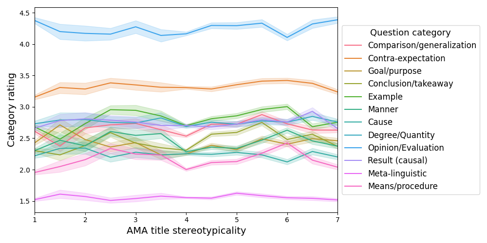 The 'gender stereotypicality' (7 being very masculine, 1 being very feminine) of an Ask Me Anything post title, does not seem to affect the kinds of questions it recieves (at least these coarse-grained categories):