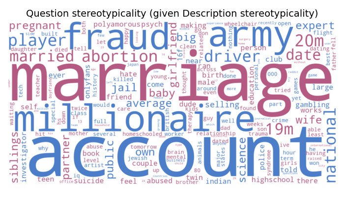 And here are some words that elicit stereotypically gendered questions (specifically: questions that are more stereotypical than one would expect based on the stereotypicality level of the words themselves!):